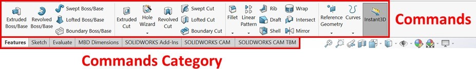 The Command Bar is located at the top of the screen. It contains all the SOLIDWORKS commands that are used for building models. It contains different categories of commands, and each category contains a set of different commands.