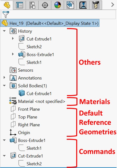 This concludes our overview of the Command Bar, which contains the different commands we will use as we build 3D models. Now, we will look at the FeatureManager Design Tree.