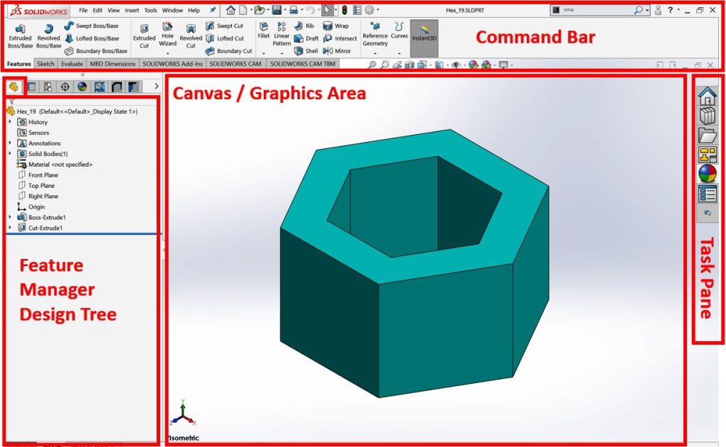We will look at the Command Bar, the FeatureManager Design Tree, the Canvas/Graphics Area, and the Task Pane
