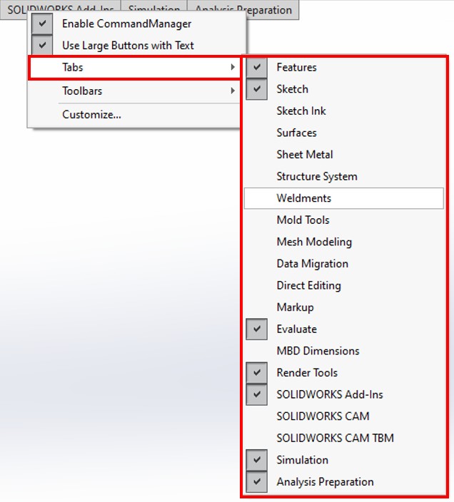 - Right-click on any of the Commands categories, and then expand the Tabs menu. Which contains more Commands categories, such as Surfaces, Weldments, and Mold Tools
