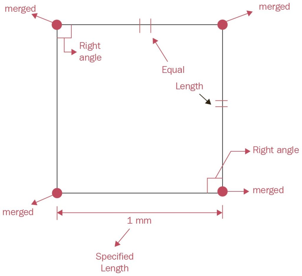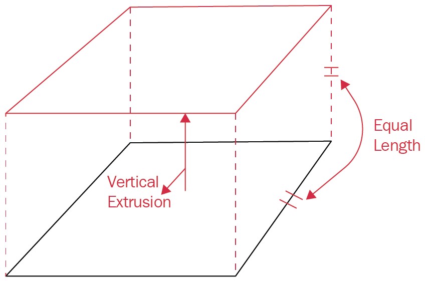 2/ Vertical Extrusion that is perpendicular to the square defined in the first set of parameters. This extrusion is by an amount equal to the length of the square’s side (1 mm). This vertical extrusion will result in the shape shown in the following diagram: