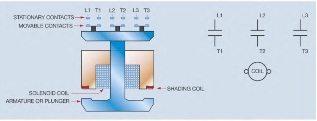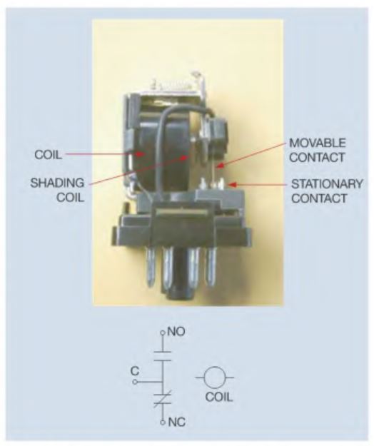 When the coil is energized, the armature is attracted to the iron core inside the coil. This attraction causes the movable contact to break away from one stationary contact and make connection with another. The common terminal is connected to the armature, which is the movable part of the relay. The movable contact is attached to the armature. The two stationary contacts form the normally closed and normally open contacts. A spring returns the armature to the normally closed position when power is removed from the coil. The shading coil is necessary to prevent the contacts from chattering. All solenoids that operate on alternating current must have a shading coil. Relays that operate on direct current do not require them